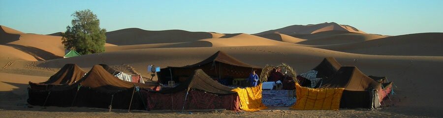 Une randonnée chamelière conviviale, d'une exceptionnelle variété de paysages, offrant une approche du désert sous tous ses facettes : l'ocre poudreux du sable, côtoie le noir de la roche : c'est le passage de l'erg au reg- puis des crêtes de sable vers des plateaux de cailloux avec de superbes canyons ponctués de petites oasis et leurs ingénieux systèmes d'irrigation. Le tout complété par la découverte de villages aux magnifiques casbahs, sans oublier les gravures rupestres et les fossiles qui abondent dans la région. Les Dunes d'Ergchebbi c'est la mer des sables et c'est là où finit l'Atlas, s'étendent les grands ergs parsemés de quelques oasis où nomadisent les hommes bleus. Une découverte du Sahara au rythme lent de la caravane Un séjour à la rencontre des tribus sahariennes.